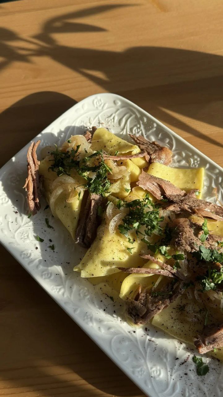 Свежие самодельные сочни, говядина длительного томления в печи, лук репчатый, винный уксус, сумах, зелень.