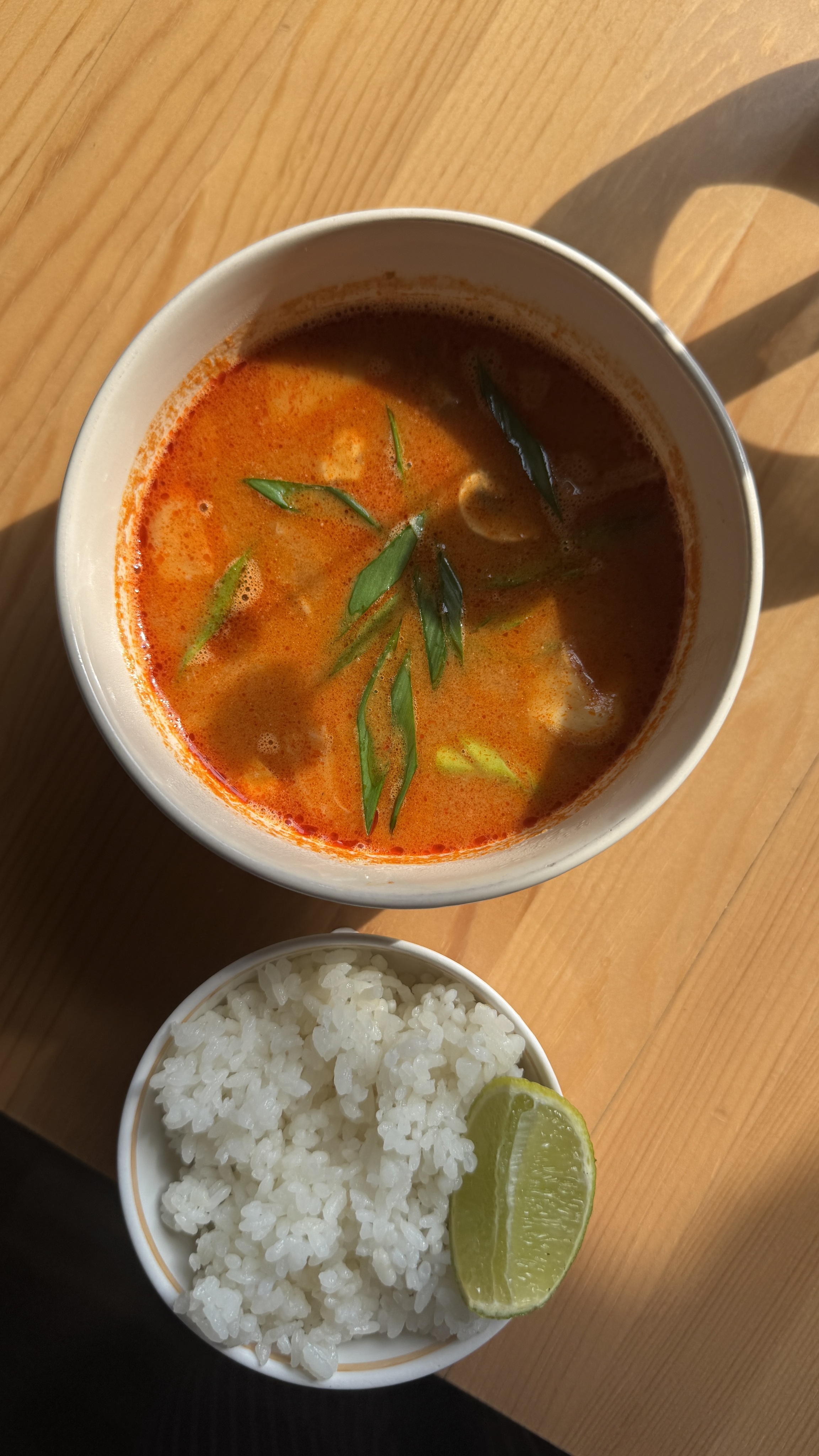 Рыбный бульон, кокосовое молоко, шампиньоны, вешенки, лосось, тигровые креветки, лемонграсс, имбрь, чеснок, лук репчатый, соевый соус, зеленый лук, рис, лайм.