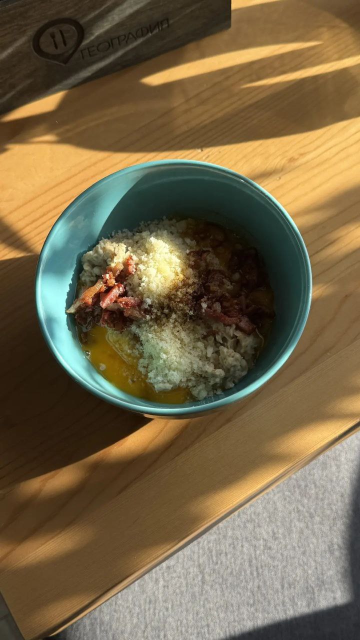 Несладкая овсянка, сваренная на сливках, с добавление поджаренного бекона, пармезана, желтка и перца.