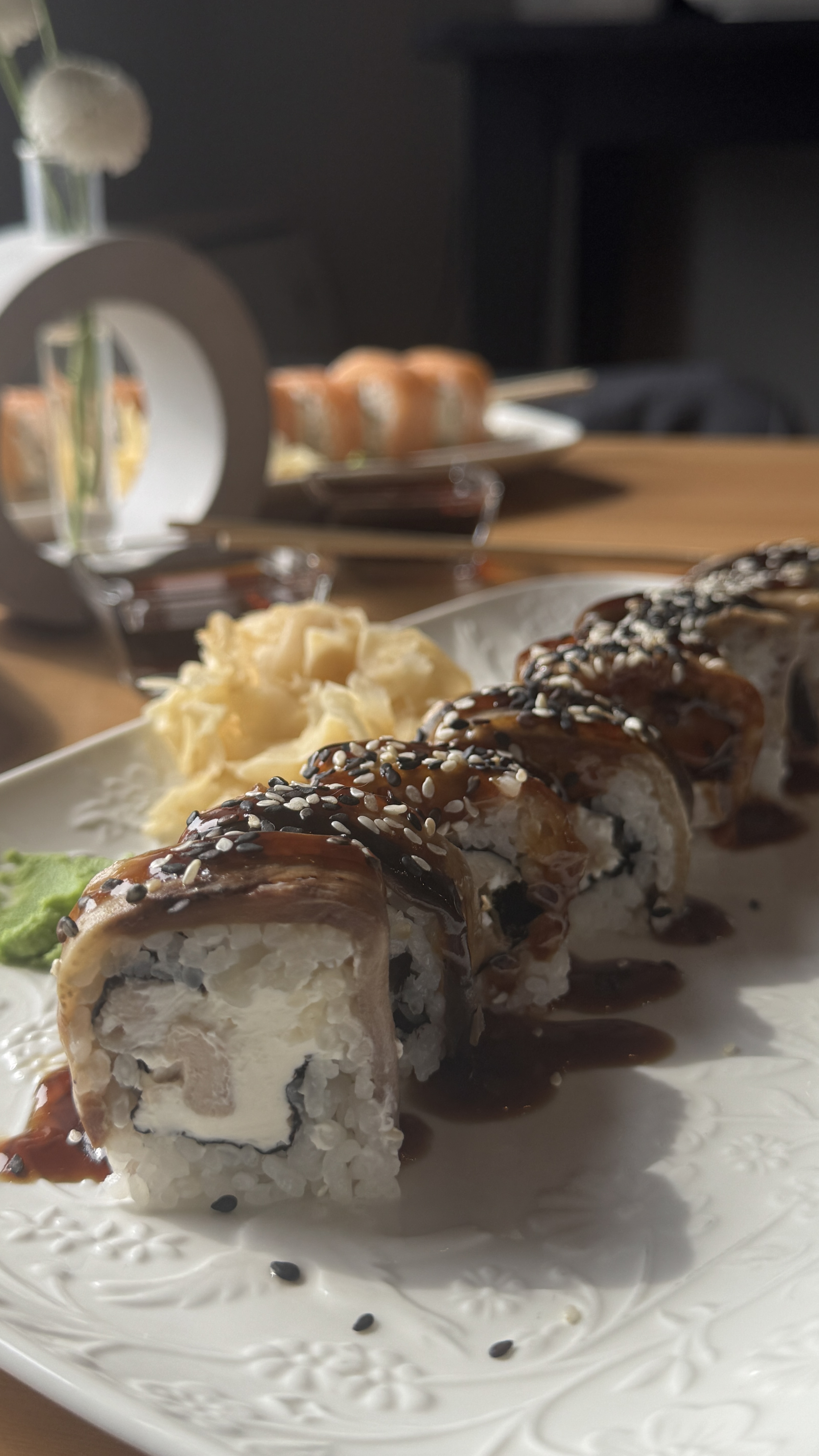 Рис, сливочный сыр, курица, баклажан, соус терияки, кунжут