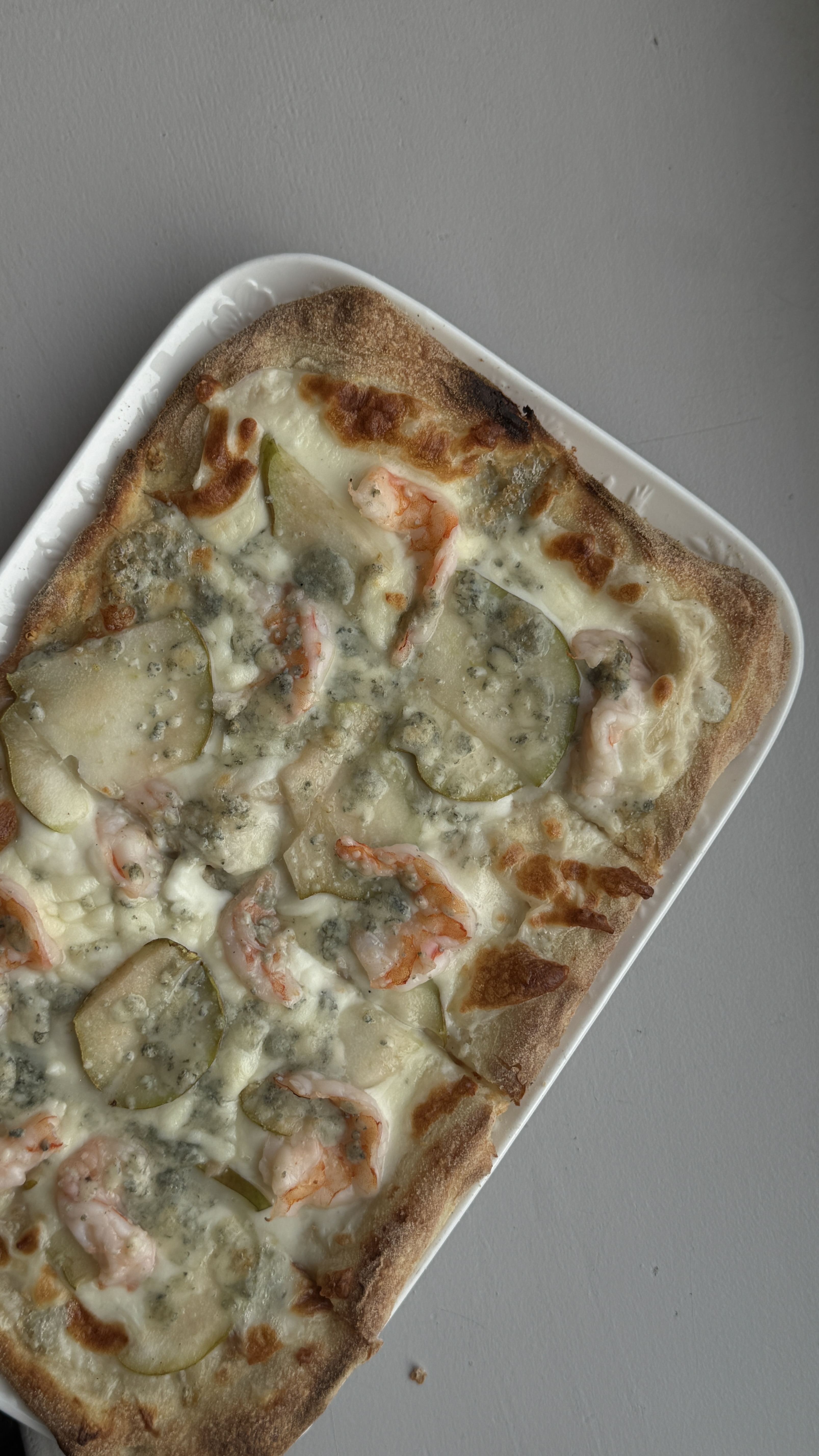 Сливочный соус, груша, креветка, горгонзолла и сыр моцарелла