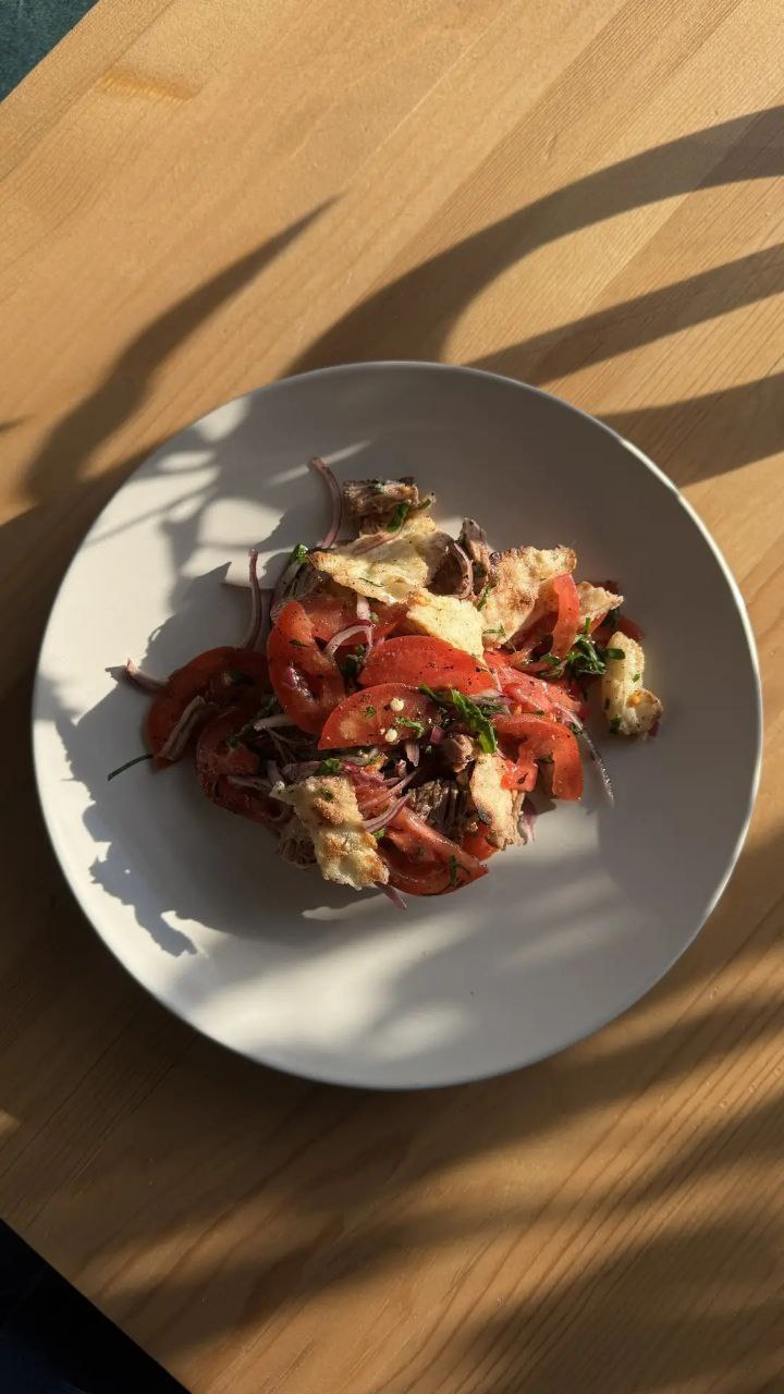 Томат, говядина растомленная в печи, красный лук, кусочки лепешки, масло оливковое, петрушка, соль, смесь перцев, уксус винный, сумах.