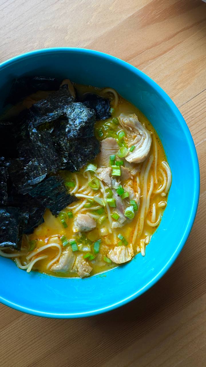 Бульон куриный, плавленный чеддер, соевый соус, курица, нори, зеленый лук
