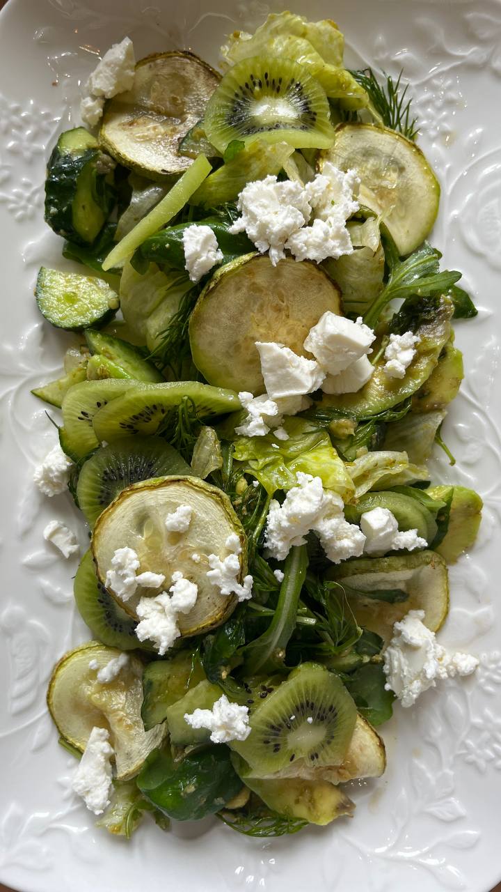 Листья салата, зелень, кабачок запеченный, оугрец, киви, брынза, мятная заправка.